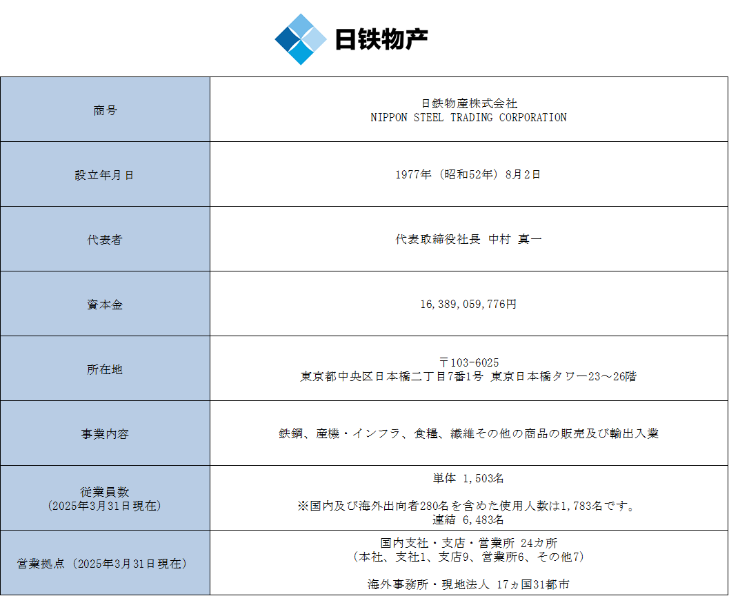 日铁物产株式会社(NIPPON STEEL TRADING CORPORATION)是全球领先的综合性商社之一,隶属于日本制铁集团,致力于钢铁、和能源等多领域的全球贸易业务。